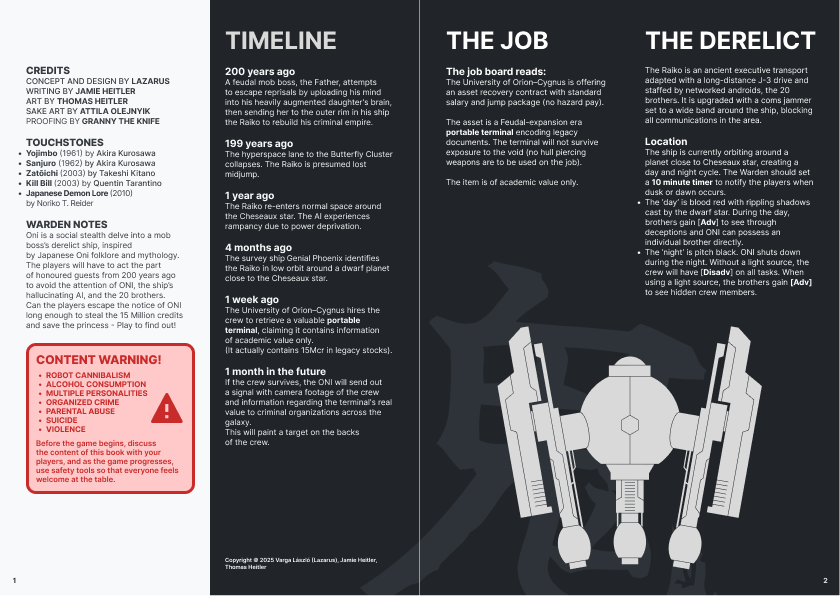 Oni is a social stealth delve into a mob boss’s derelict ship, inspired by Japanese Oni Folklore and mythology. The players will have to act the part of honoured guests from 200 years ago to avoid the attention of ONI, the ship’s hallucinating AI, and the 20 brothers. Can the players escape the notice of ONI long enough to steal the 15 million credits and save the princess? play to find out!